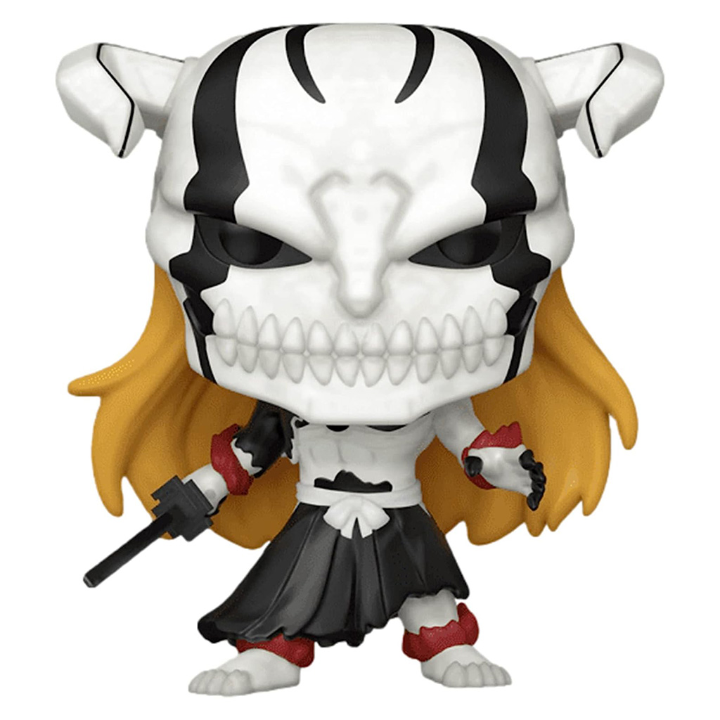 O momento em que Ichigo Kurosaki perde o controle e atinge a forma Fully-Hollowfied (Vasto Lorde) é um dos mais icônicos da história dos animes. Esta figura da Funko, sob o número #1104, imortaliza essa transformação brutal com precisão assustadora. Por ser uma edição CHASE, ela representa a versão mais difícil de encontrar (proporção 1 em 6), tornando-se instantaneamente o "Santo Graal" de qualquer coleção de Bleach. Fabricado em vinil de alta qualidade, o Pop! destaca a máscara branca completa com os longos chifres, as marcas vermelhas características e o cabelo ruivo esvoaçante, capturando a energia indomável de Ichigo em sua luta contra Ulquiorra Cifra.