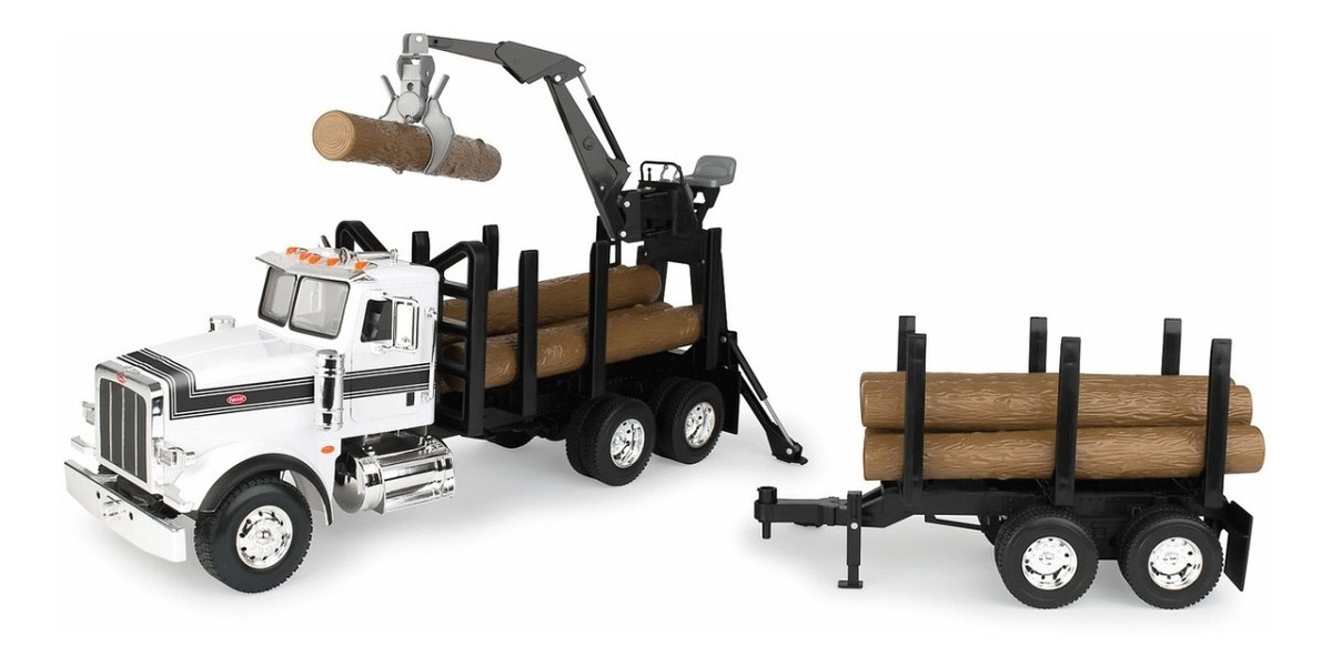 Conteúdo: 1 Caminhão Peterbilt 367, 1 Reboque Pup e 10 toras de plástico simuladas.