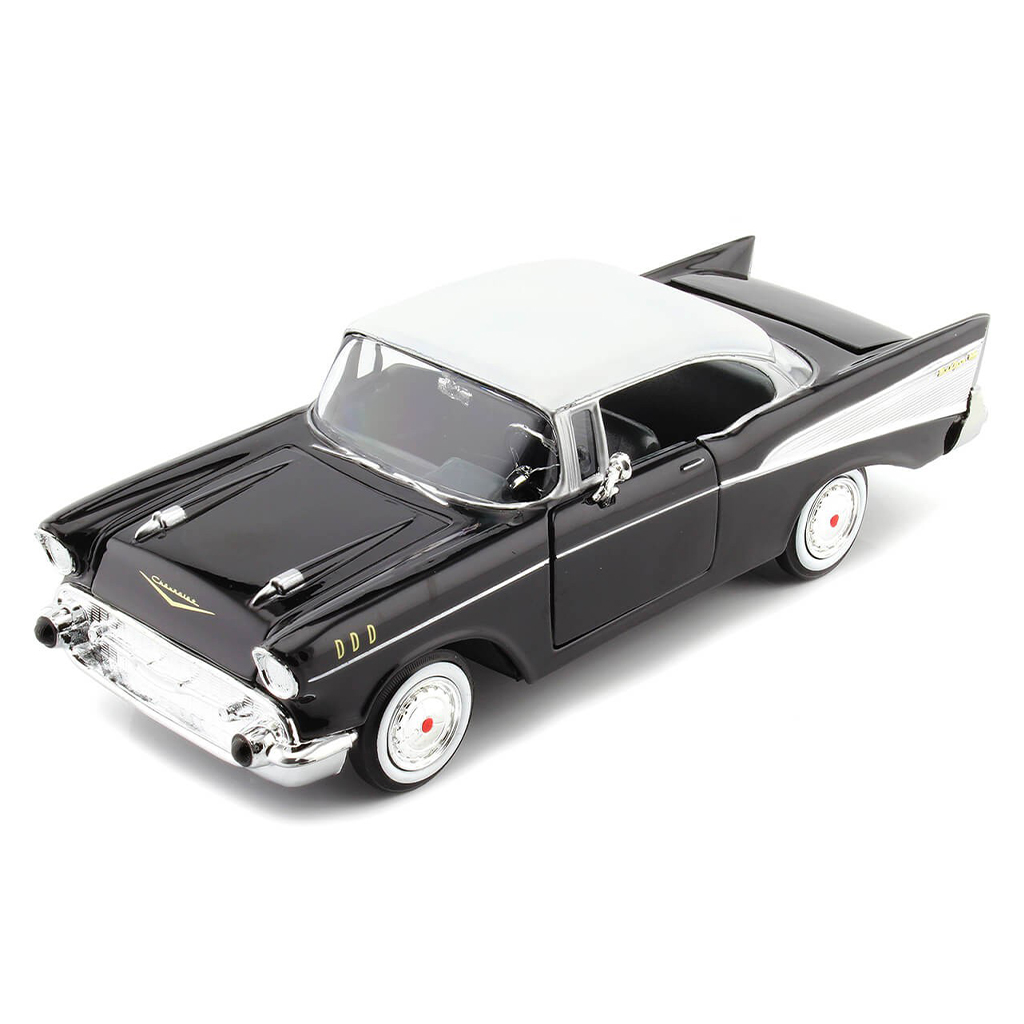 Reviva a era de ouro dos carros americanos com esta réplica impecável do Chevrolet Bel Air 1957 na cor preta, um clássico que marcou época.