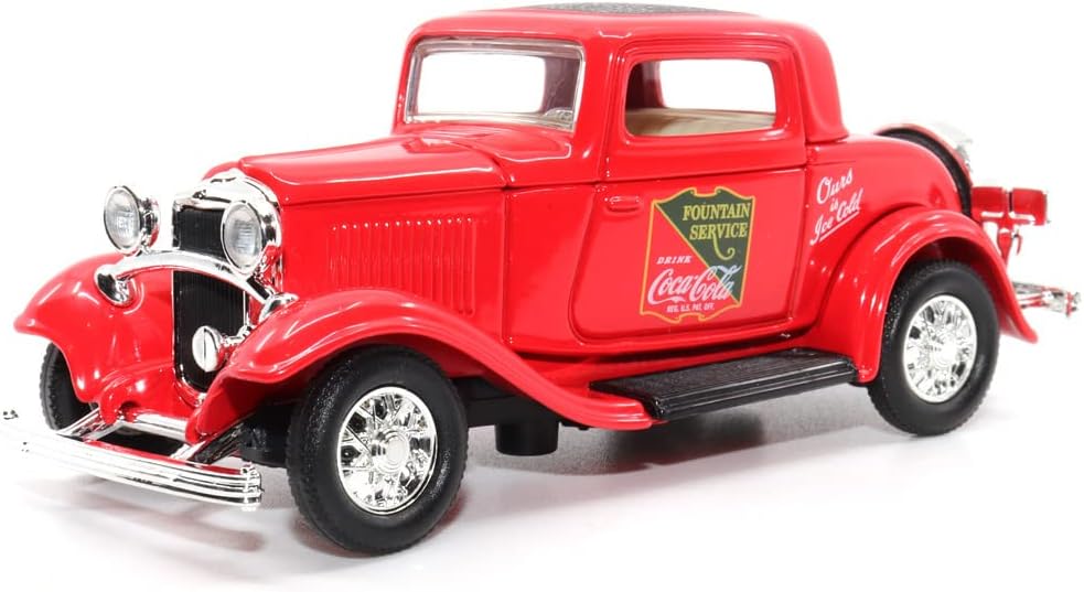 O Ford 1932, imortalizado como o "Deuce Coupe", é um dos pilares da indústria automobilística americana. Nesta edição exclusiva da Motor City Classics (Ref: 443030), ele celebra o "Fountain Service" da Coca-Cola, remetendo aos tempos áureos das lanchonetes e farmácias americanas onde a bebida era servida gelada. Com o icônico logotipo da marca aplicado sobre a carroceria vermelha profunda e o teto texturizado, esta miniatura é uma viagem nostálgica à década de 30, unindo a robustez da Ford à alegria de uma das maiores marcas da história.