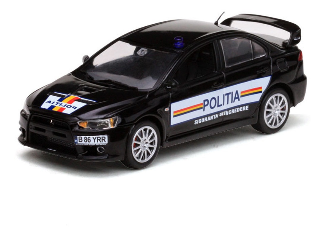 O Mitsubishi Lancer Evolution X é mundialmente famoso por sua tração integral e motor turbo, características que o tornam o interceptador ideal para as forças policiais da Romênia (Poliția Română). Esta réplica da Vitesse, na escala 1/43, captura a presença intimidadora da viatura em sua configuração preta, adornada com os grafismos refletivos e o brasão oficial, representando a elite do policiamento rodoviário no Leste Europeu.