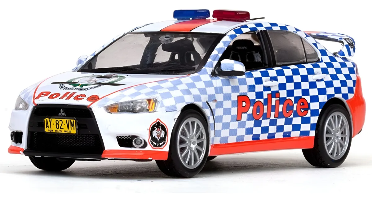 O Mitsubishi Lancer Evolution X não é apenas um ícone dos ralis; na Austrália, ele foi transformado em uma poderosa ferramenta de interceptação rodoviária. Com tração integral e motor turbo, o "Evo X" foi escalado para garantir a segurança em alta velocidade. Esta réplica da Vitesse, na escala 1/43, captura com perfeição a presença intimidadora da viatura australiana, apresentando a pintura branca com os icônicos grafismos em xadrez azul e amarelo (estilo Battenburg) e o conjunto completo de sinalização luminosa de emergência.