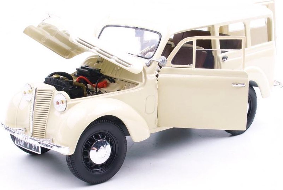 O Renault Break 300 kg, derivado do Juvaquatre, foi o parceiro inseparável de artesãos, comerciantes e famílias na França dos anos 50. Com sua mecânica robusta e silhueta arredondada inconfundível, ele ajudou a movimentar a economia e a vida urbana no pós-guerra. Esta réplica da Norev (código 185260), na escala 1/18 e cor Marfim, resgata essa atmosfera com uma fidelidade impressionante, capturando desde a grade frontal "cascata" até o amplo espaço de carga traseiro.