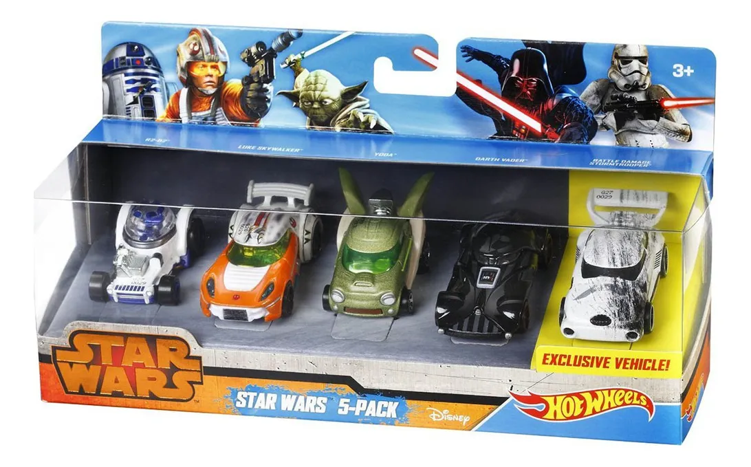 Quais carrinhos vêm no Pack 5 de Star Wars da Hot Wheels? O kit traz cinco veículos inspirados nos personagens mais famosos, incluindo Darth Vader, Luke Skywalker, Chewbacca, R2-D2 e o Stormtrooper, todos com design automotivo exclusivo.